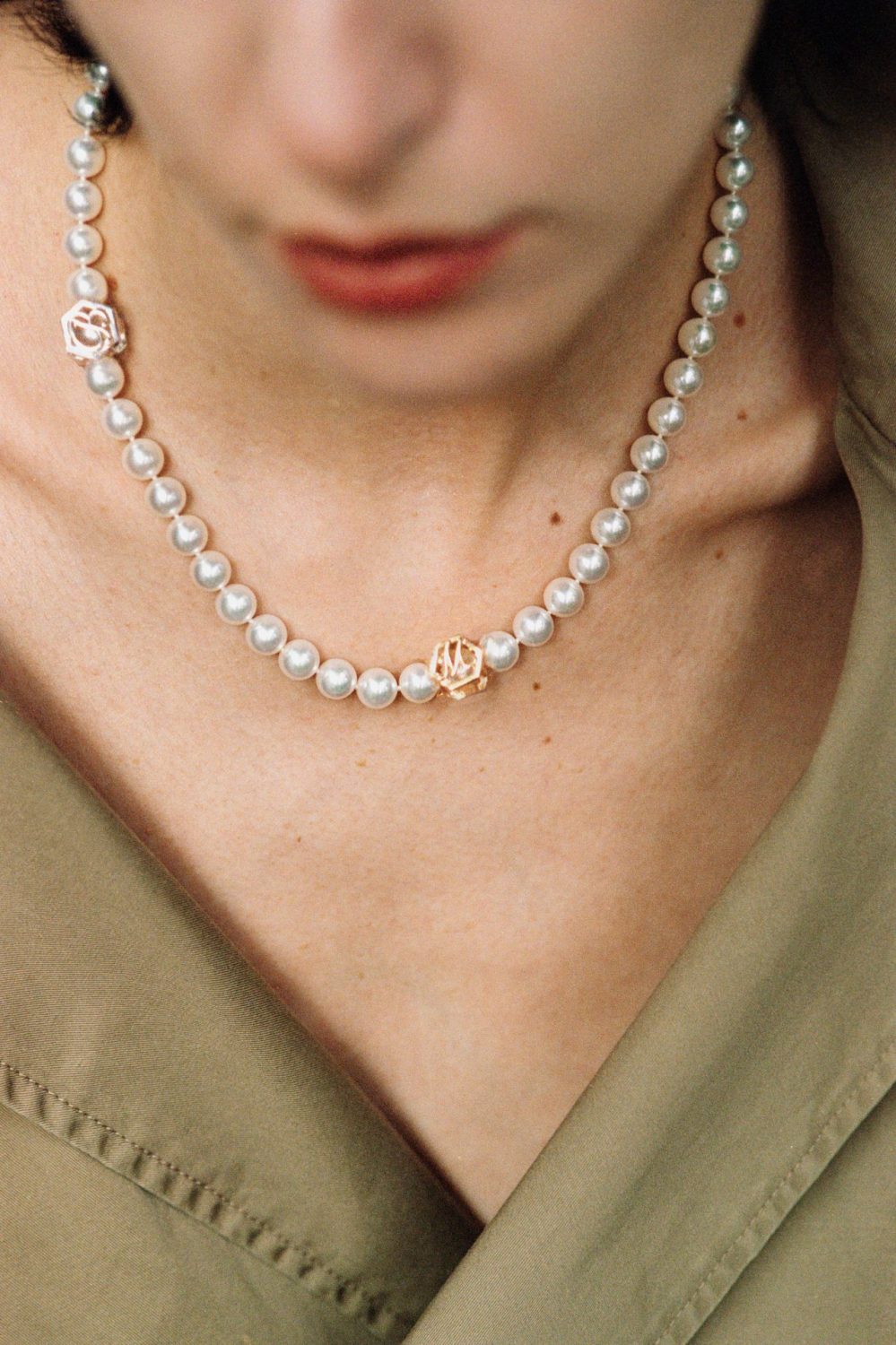珠と珠の間にわずかな余白を持たせたパールネックレスは、鎖骨の動きに沿ってしなやかに揺れ、カジュアルなスタイリングにも自然に溶け込みます。ネックレス3型にはいずれも、「M」と「B」が片面ずつ刻まれたリバーシブルのシルバーチャームが付属。気分やスタイルに合わせて自由に位置を変えて楽しめます。