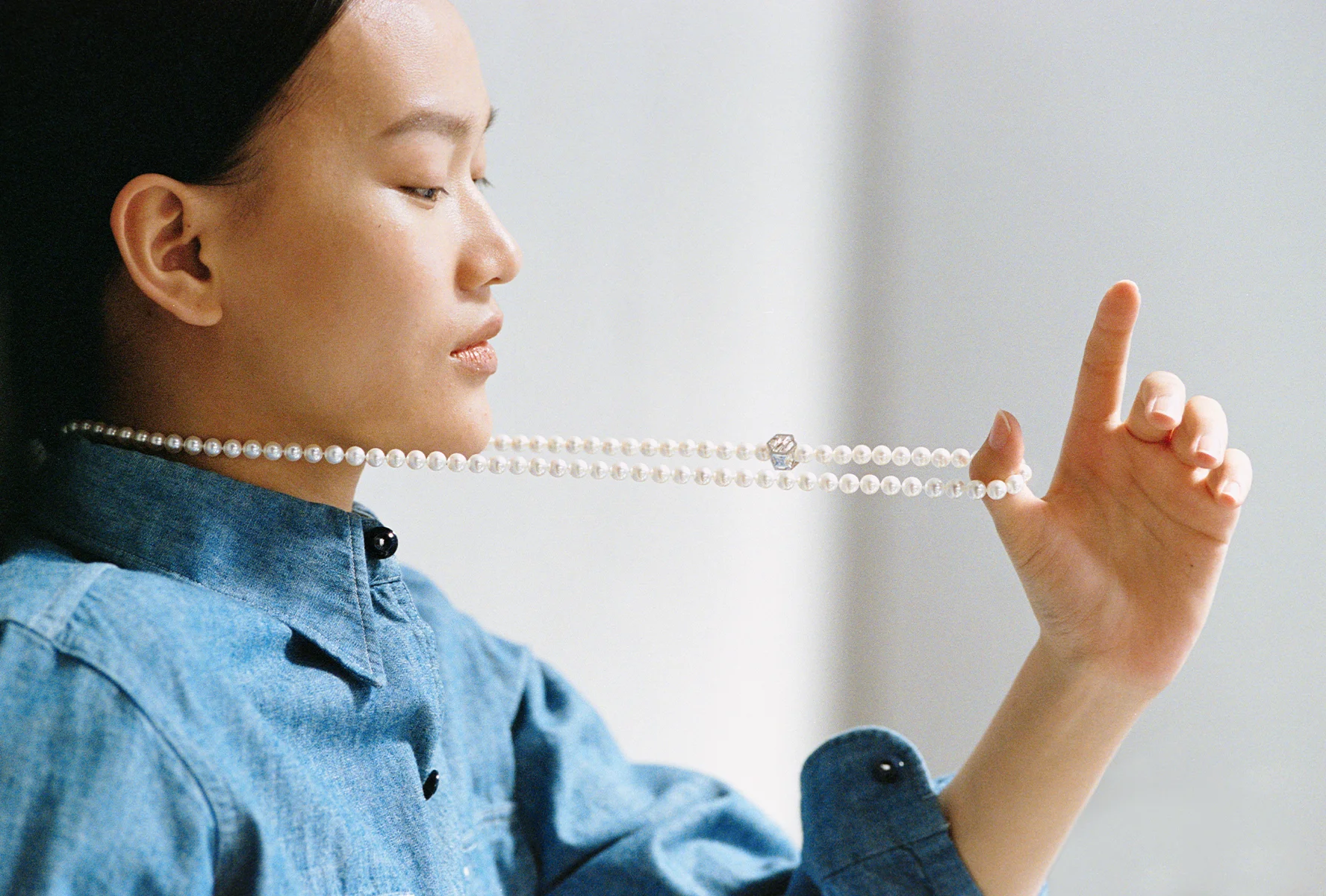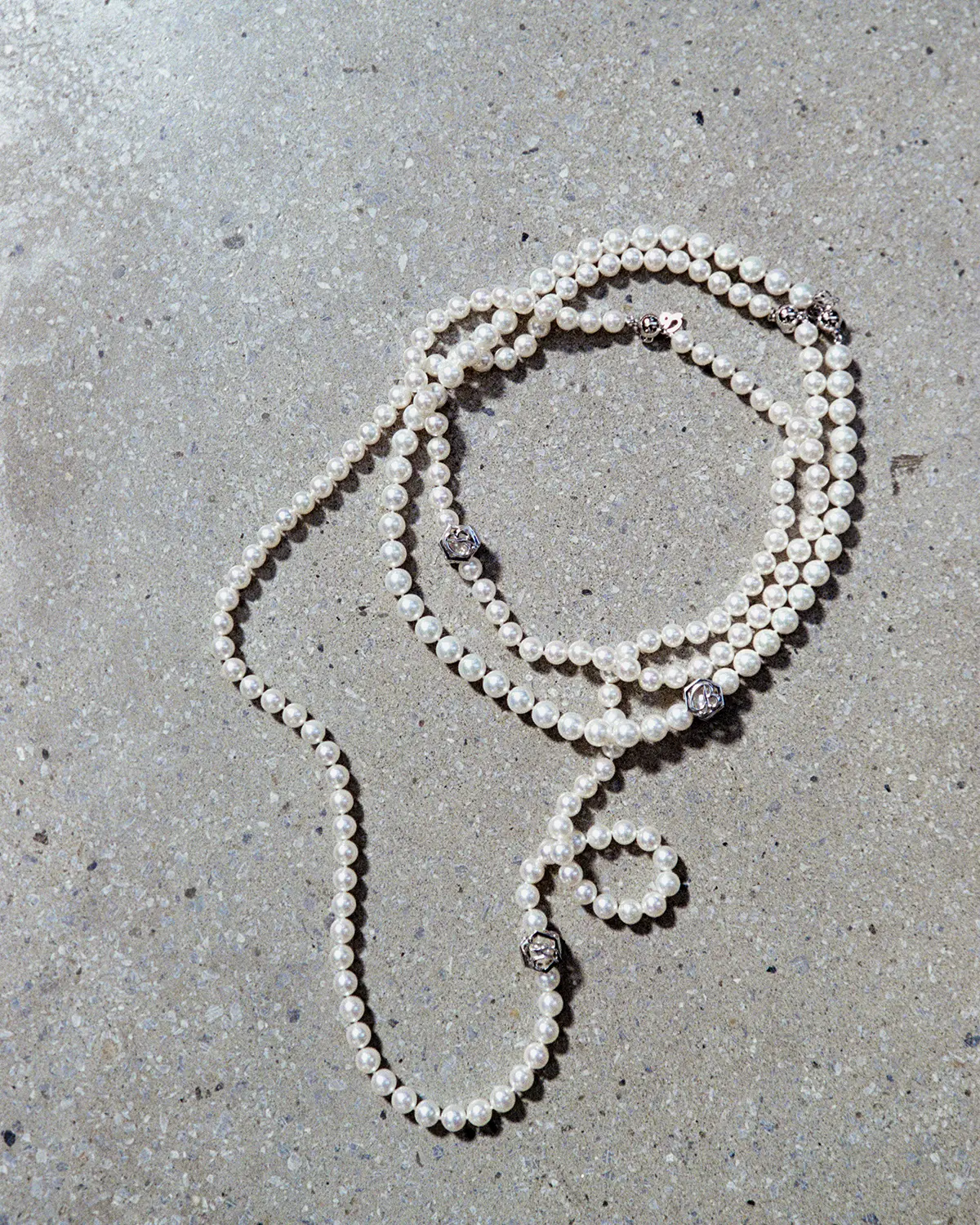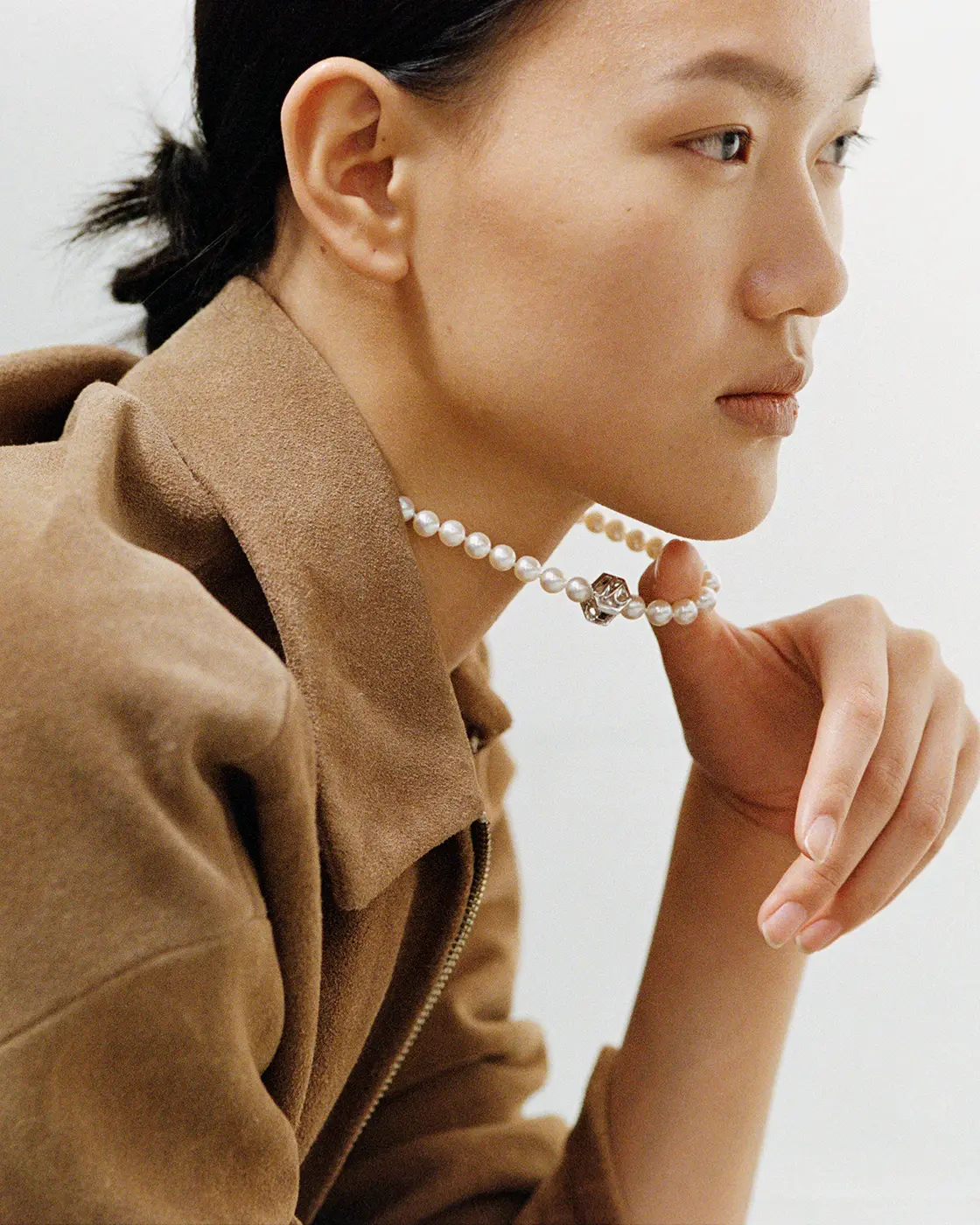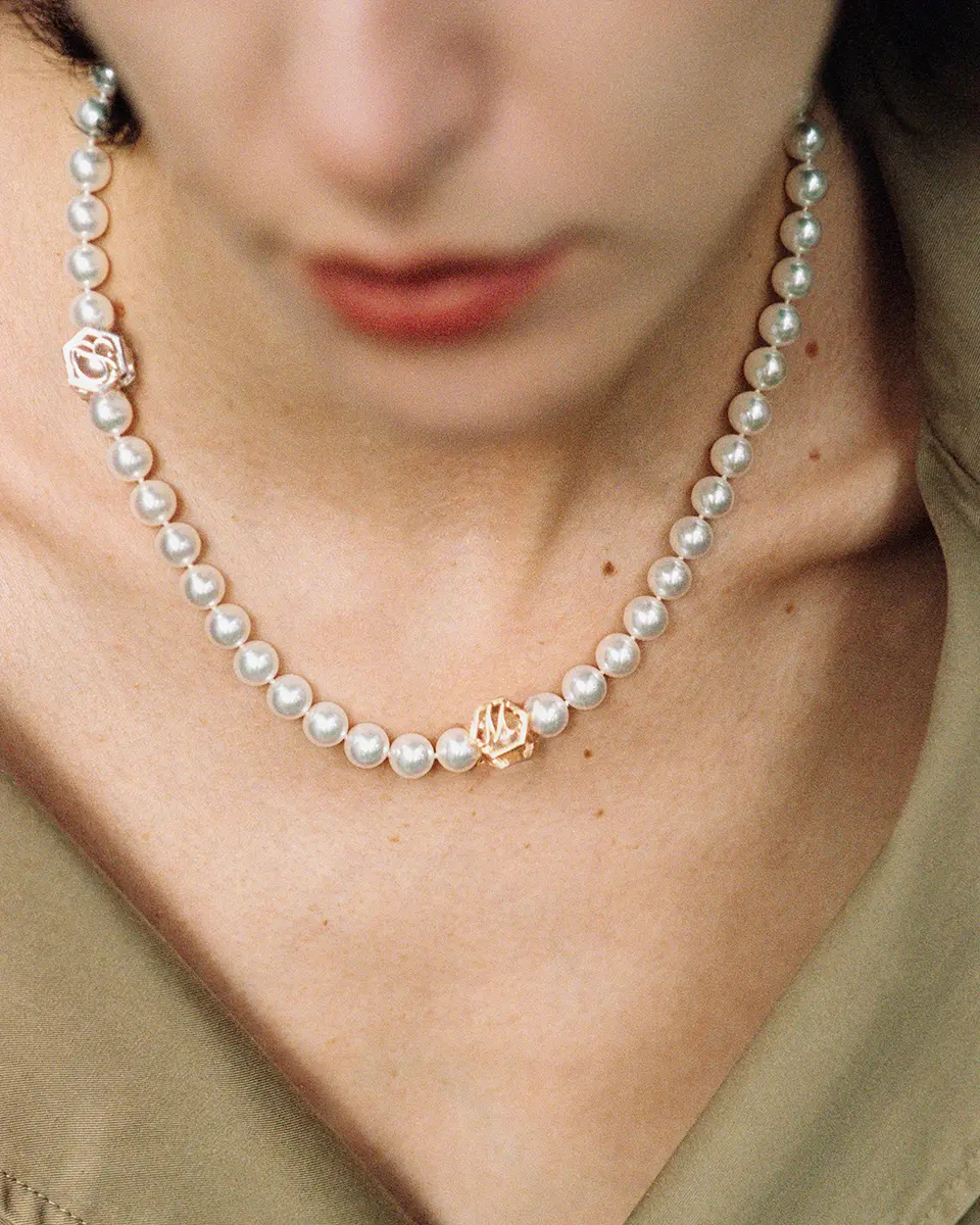 The soft white unique to uncolored pearls quietly shifts its expression against the skin and in the light. The arrangement, with its subtle spacing, creates a supple movement around the neckline, blending naturally with the curve of the collarbone. Derived from the French word ‘grigri’ (amulett), MADISONBLUE’s pearls blend into your daily attire like a second skin, quietly accompanying your staple wardrobe.