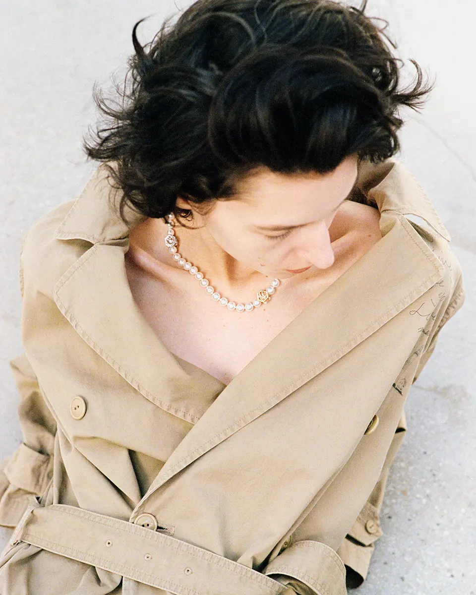 無調色ならではのやわらかな白は、肌や光の中で静かに表情を変える。わずかな余白をもたせた連なりが首元にしなやかな動きを生み、鎖骨の曲線に自然に馴染む。フランス語の「grigri(お守り)」に由来するMADISONBLUEのパールは、セカンドスキンのように日々の装いに溶け込み、定番のワードローブに静かに寄り添う存在です。