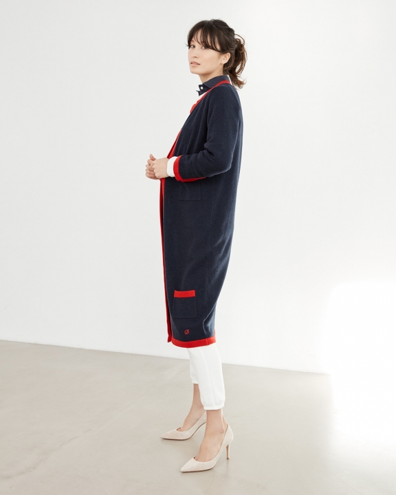 カシミヤ混のロングニットは、赤のパイピングがポイント。